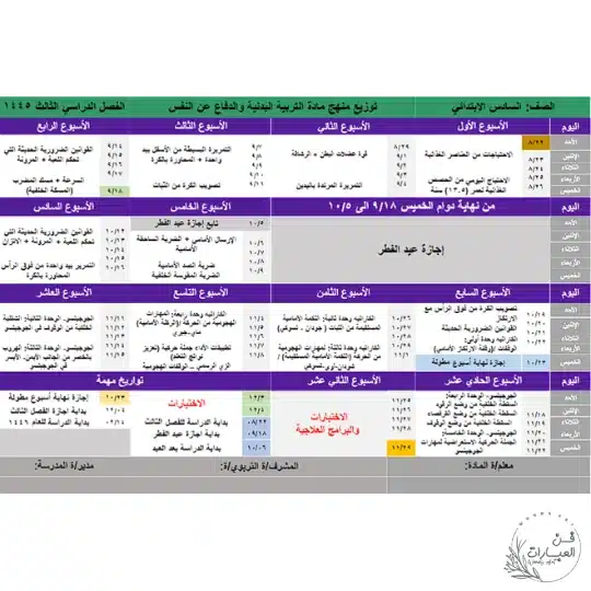 توزيع التربية البدنية سادس ابتدائي الفصل الثالث