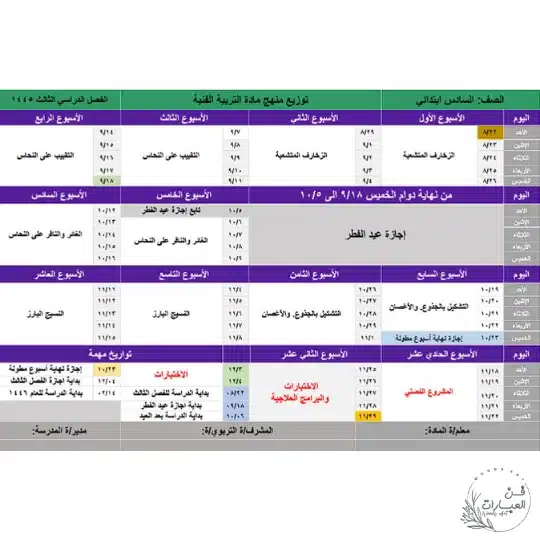 تحميل توزيع منهج التربية الفنية الصف سادس ابتدائي الفصل الدراسي الثالث للعام 1445 هجري