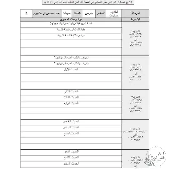 توزيع مادة الحديث 1 أولى مشتركة الفصل الثالث