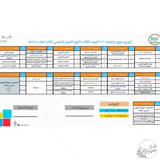 تحميل توزيع منهج الرياضيات3 سنة ثالثة المسار العام الفصل الدراسي الثالث للعام 1445 هجري