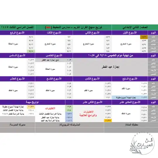 تحميل توزيع منهج القرآن الكريم تحفيظ الصف ثاني ابتدائي الفصل الدراسي الثالث للعام 1445 هجري