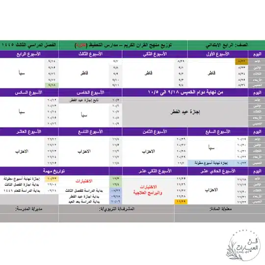 تحميل توزيع منهج القرآن الكريم تلاوة رابع ابتدائي الفصل الدراسي الثالث للعام 1445 هجري