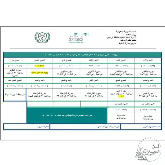 رابط تحميل توزيع مقرر القرآن الكريم pdf مباشر من موقع فن العبارات التعليمي.