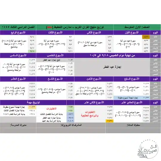 توزيع القرآن الكريم حفظ أول متوسط الفصل الثالث