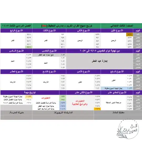 تحميل توزيع منهج القرآن الكريم حفظ الصف ثالث ابتدائي الفصل الدراسي الثالث للعام 1445 هجري