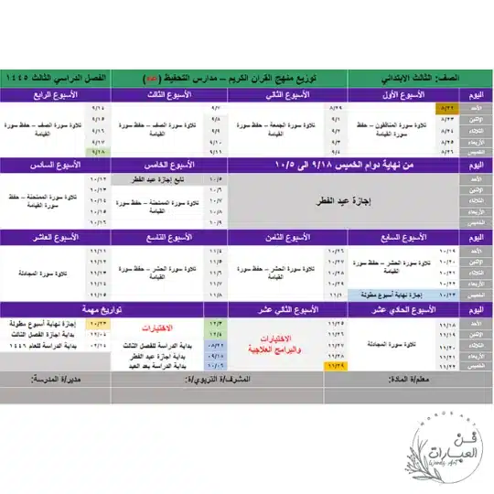 توزيع القرآن الكريم عام ثالث ابتدائي الفصل الثالث