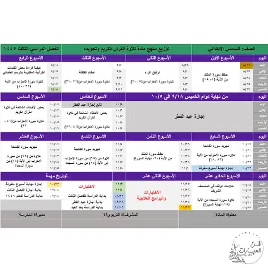 توزيع القرآن الكريم عام سادس ابتدائي الفصل الثالث