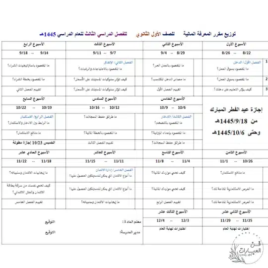 تحميل توزيع منهج المعرفة المالية سنة أولى مشتركة الفصل الدراسي الثالث للعام 1445 هجري