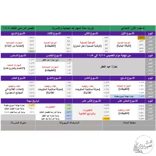 توزيع المهارات الحياتية والأسرية أول متوسط الفصل الثالث