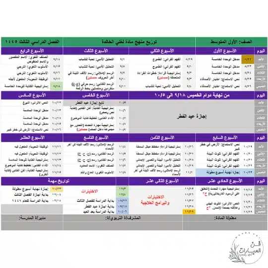 توزيع مادة لغتي الخالدة الصف أول متوسط الفصل الثالث
